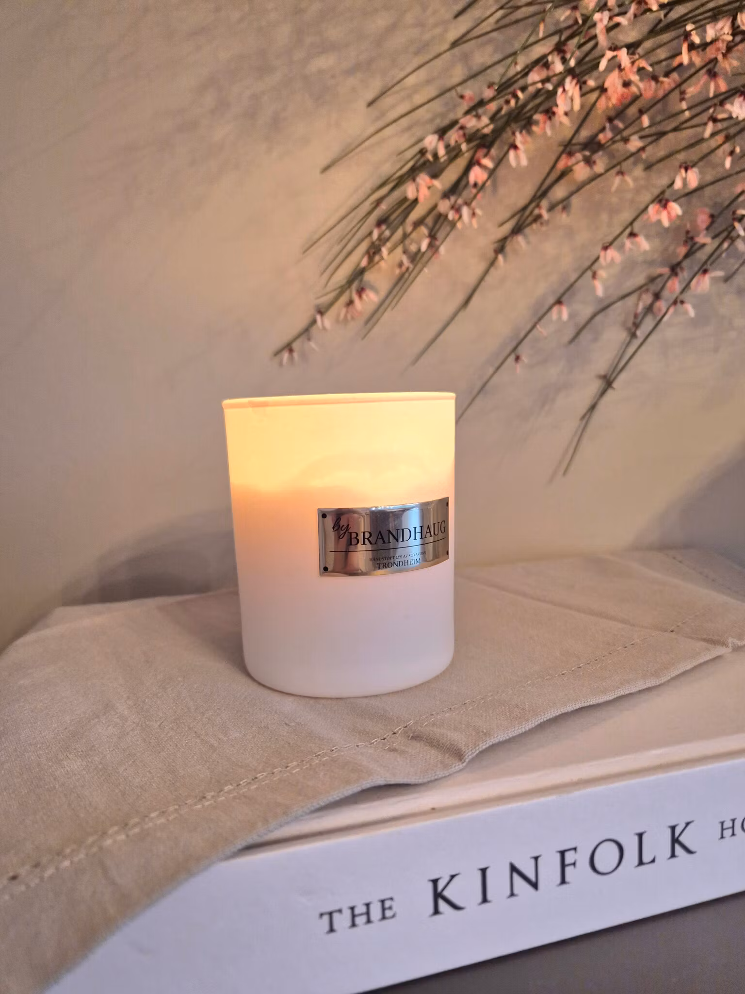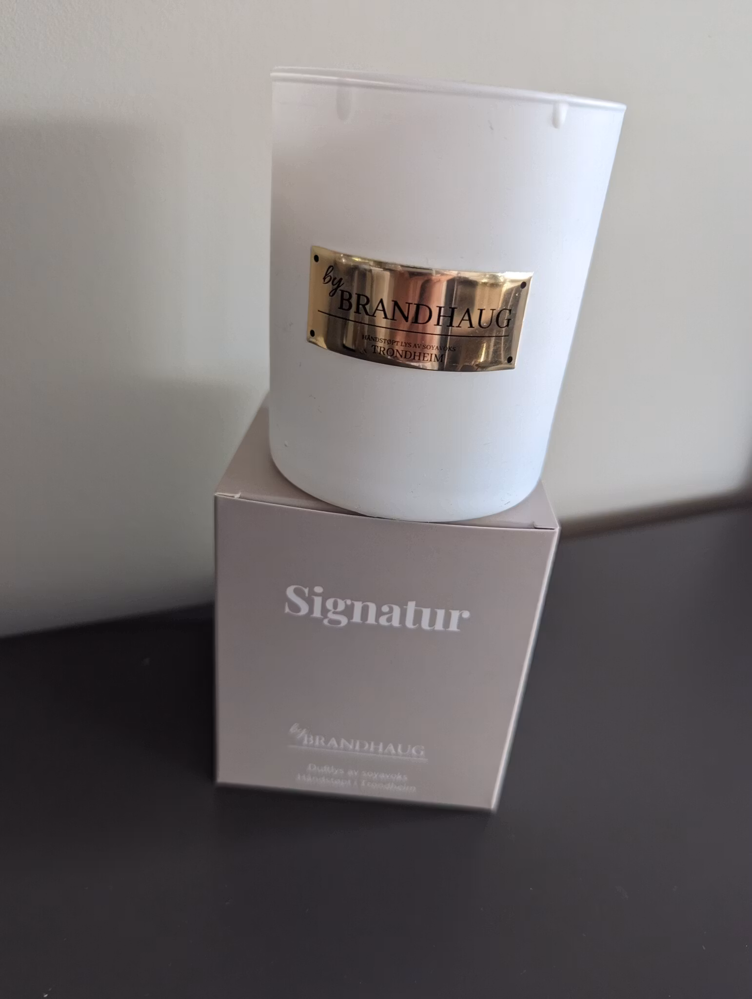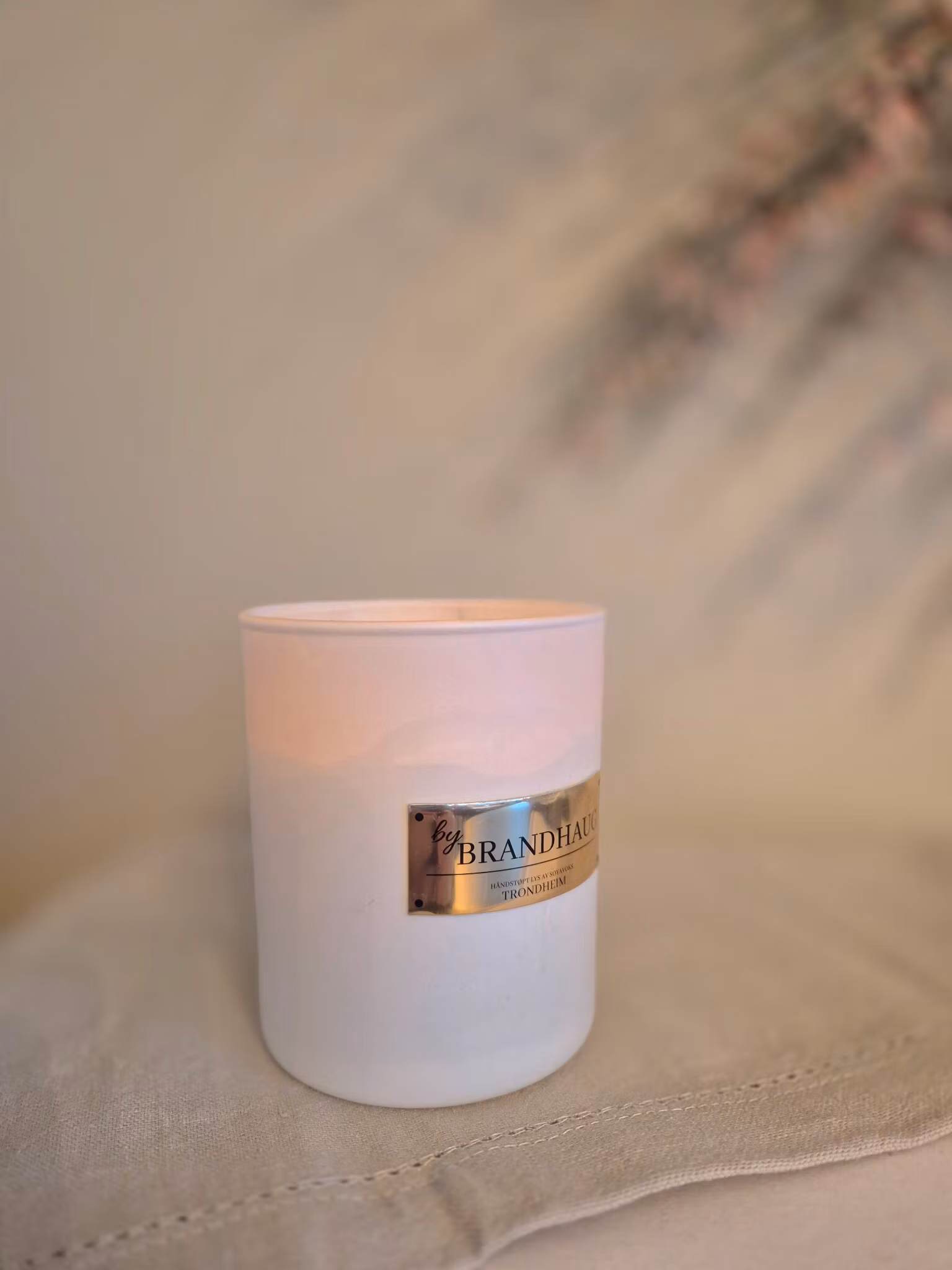 Lyset er håndstøpt av meg i 200 g soyavoks, med en bomullsveke som gir ca. 55 timers brennetid. Det leveres i hvitt glass med gullfargede detaljer, pakket i en hvit eske med gulldetaljer – en gave som uttrykker omsorg og nærhet.