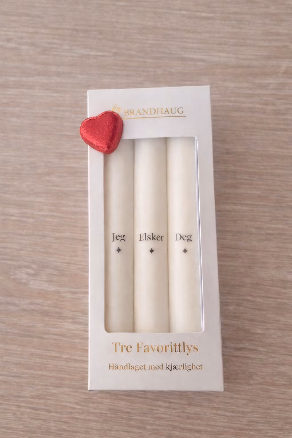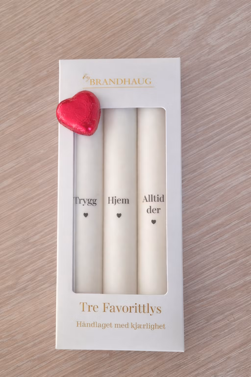 Tre Favorittlys er en eksklusiv og diskret gaveeske med 3 hvite kronelys, laget i 100% stearin og satt sammen med ord som betyr noe – enten du vil gi en klem til mamma, eller skape stemning til valentinsdag.