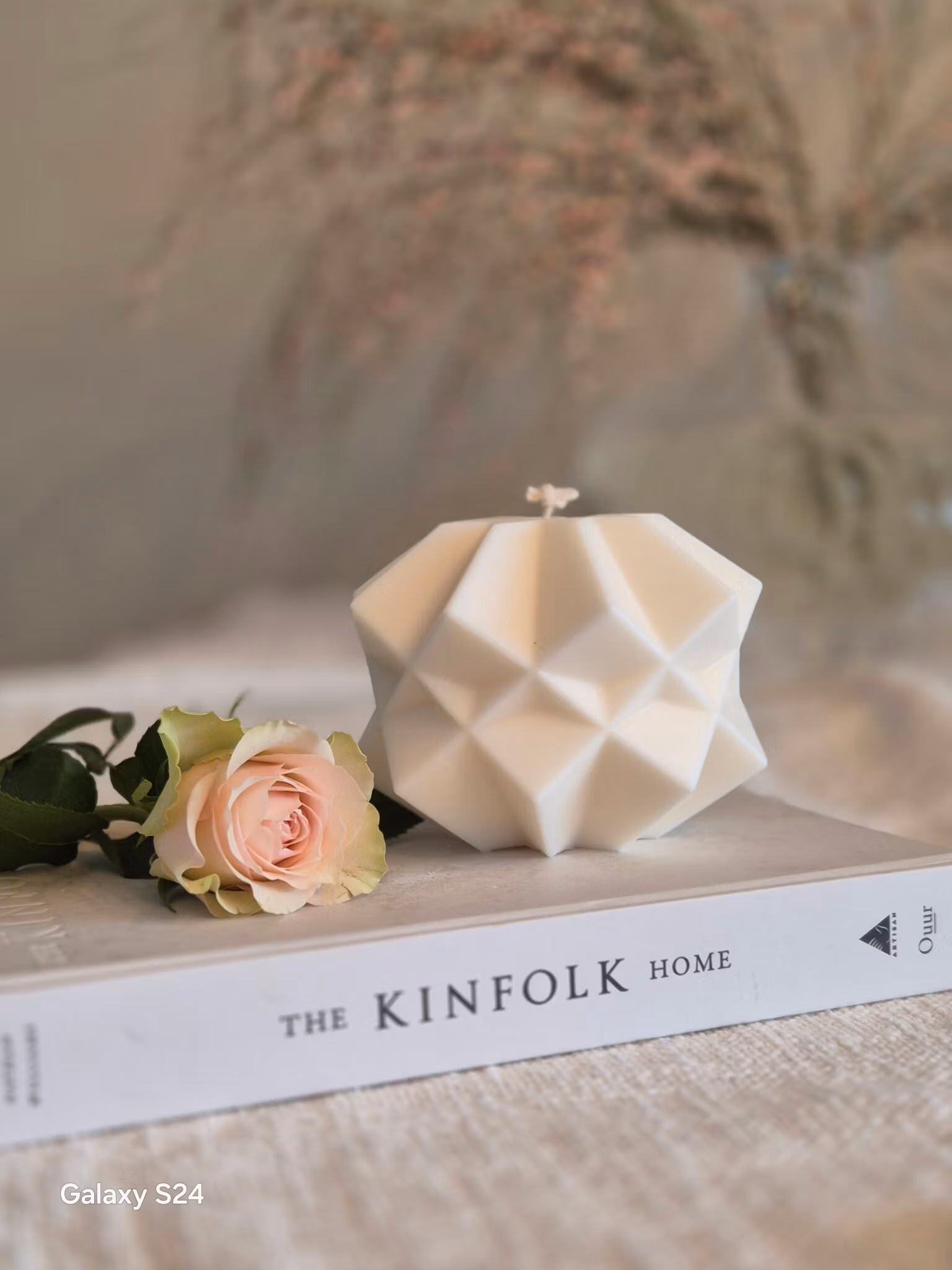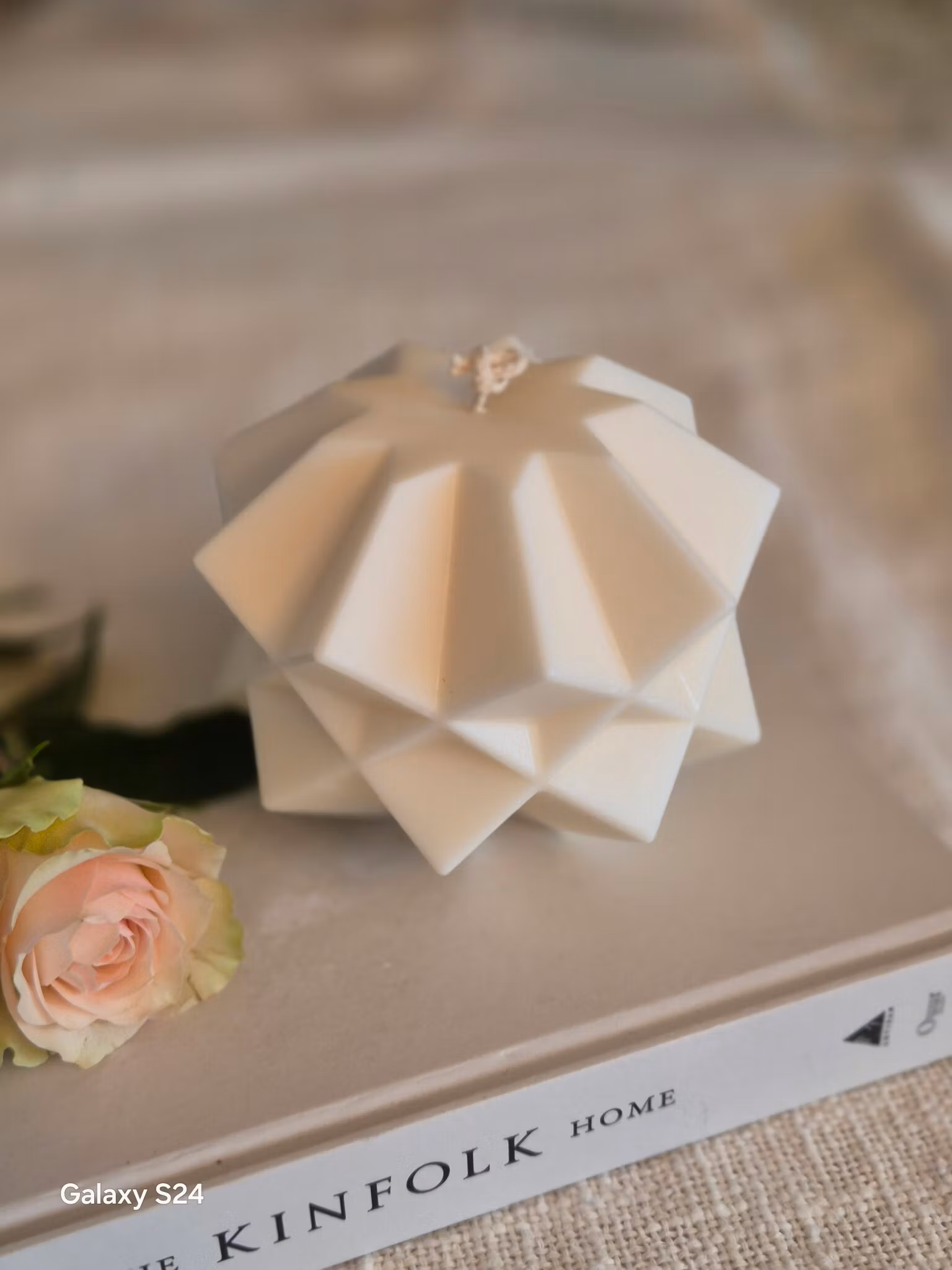 Dette eksklusive dekorlyset, kalt Diamant, er en del av min nye kolleksjon av luksuriøse lys. Med sin unike geometriske form, som kombinerer en stjerne og en diamant, er dette lyset både sofistikert og iøynefallende. Lyset måler 11 cm i høyden og 13 cm på det bredeste, og er laget av en soyavoksblanding.